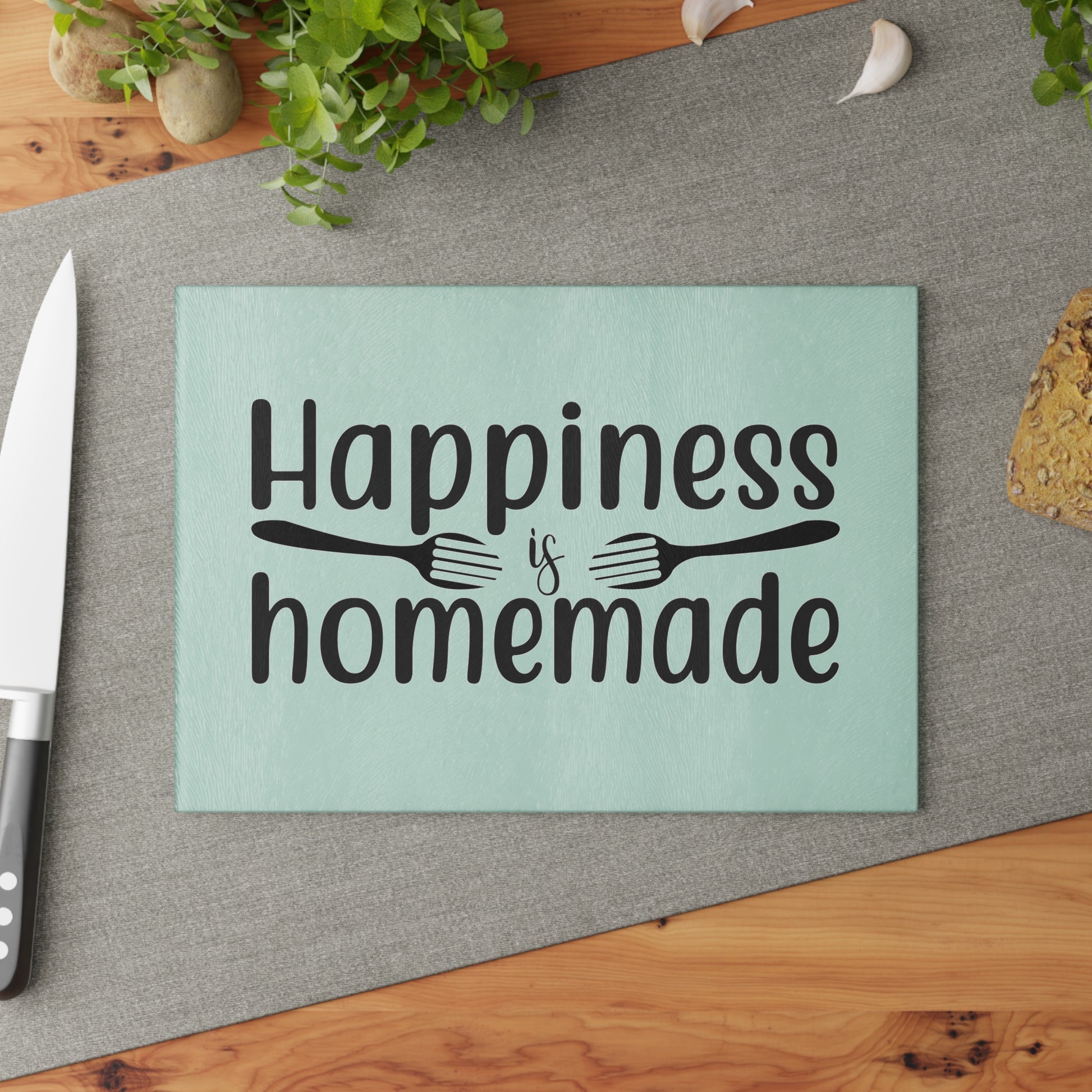 Bring warmth and personality to your kitchen with this “Happiness Is Homemade” tempered glass cutting board—a beautiful and functional addition to any home. Featuring a soft mint background and charming hand-lettered quote with fork accents, this decorative kitchen cutting board adds a cheerful farmhouse touch to your countertop while offering a durable surface for chopping, prepping, and serving.